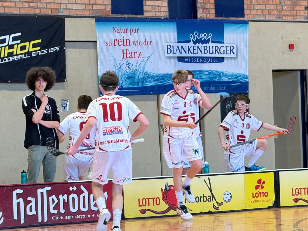 Somit war das Ziel für die 2. Halbzeit klar- 3 Punkte nach Weißenfels bringen, was auch gut startete: Binnen 3 Minuten schossen Karl und Erik Schilling 4 Tore (1/3). Das Spiel wurde gedreht-8:10 für den UHC. Nach einer Auszeit der Wenigeröder lies allmählich das Tempo des Spieles nach. Trotzdem wurde noch 3 Tore geschossen. Eines durch Erik und 2 durch die Heimmannschaft- den Red Devils. Jedoch reichte dies nicht und unsere U15 gewann gegen den Favoriten trotz 6 Mann Kader mit 10:11.