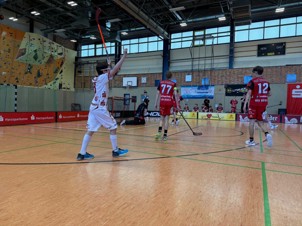 So konnte unsere Mannschaft ohne Druck aufspielen, was man auch bemerkte. Nach kurzzeitigem Rückstand erzielte Erik das 1:1, danach folgte ein wahrer Schlagabtausch- bis zur Halbzeit zieht Wernigerode mit Toren an aber unsere U15 gleicht immer wieder aus. Jedoch stand es zur Halbzeit 7:6 für die Devils. Die Tore schoßen: 3x Erik, 2x Max, Jonas.