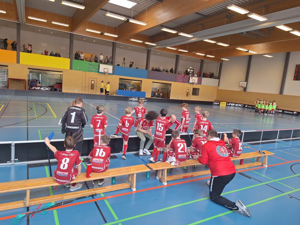 Nach dem erfolgreichen Kleinfeld-Spieltag am Vortag trat der UHC mit Bella und den „schnellen Jungs“ in Zwickau auf dem Großfeld an – und war trotz einer Stunde weniger Schlaf hellwach. Gegen die Schakale aus Schkeuditz startete das Team stark: Bereits nach 30 Sekunden hatte Luis Finn nach Vorlage von Gregor die erste Großchance. Der UHC erspielte sich zahlreiche Möglichkeiten, doch zunächst fehlte die Belohnung. Stattdessen ging Schkeuditz nach einem Abwehrfehler mit 1:0 in Führung. Nach insgesamt 17 Torschüssen erlöste Jannik das Team in der 8. Minute mit dem 1:1. Danach lief es: Leonard traf von der Mittellinie zum 1:2, Gregor erhöhte auf 1:3 und Ole stellte mit einem cleveren Bauerntrick auf 1:4. Weitere gute Aktionen – unter anderem ein starkes Zuspiel auf Conrad – blieben bis zur Pause ohne Tor. Im zweiten Abschnitt baute der UHC die Führung konsequent aus: Luis (Vorlage Gregor) traf zum 1:5, Henry Keikott erhöhte auf 1:6 und Fritz versenkte den Ball sehenswert zum 1:7 im oberen Eck.