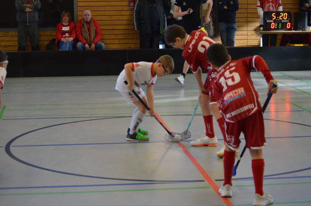 Im ersten Spiel des Tages musste es der Gastgeber mit der Mannschaft des BSV Markranstädt aufnehmen. Schon nach wenigen Sekunden gab Jannik den ersten Schuss auf das gegnerische Tor ab und sollte damit bereits ein Indiz für die Spielrichtung geben. Nach mehreren erfolglosen Angriffen traf Klemens in der 3. Minute per Distanzschuss zum 1:0. Dennoch war es ein nervöser Start des UHC und die Aufgeregtheit sollte auch das ganze Spiel nicht richtig weichen. Neben dem aggressiven Spiel des Gegners machte es sich der UHC selbst schwer. Es dominierten wenige Zuspiele und viele Einzelaktionen, wodurch mehrere Torchancen ins Leere verliefen. Dass sie es auch anders können, zeigten die Weißenfelser zum Glück kurz darauf, indem schöne Spielzüge mit weiteren Toren belohnt wurden. Jannik konnte in der 7. Minute auf 2:0 erhören und Ole traf nach Vorarbeit von Emil zum 3:0 ins kurze Eck. Im Anschluss baute Jannik mit einem Hattrick den Vorsprung auf 6:0 aus. Kurz darauf wurde es hektisch– das Ping Pong Spiel vor dem Weißenfelser Tor konnte Rojus jedoch zum Glück entschärfen und hielt sein Tor sauber. Den Schlusspunkt der ersten Halbzeit setzte Henry mit einem schönen Schuss nach Zuarbeit von Gregor (7:0).