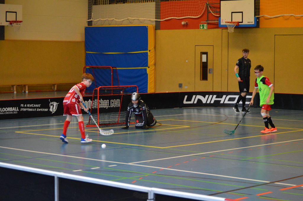 Das 3:1 erzielte nach 5:51 Minuten Emil. Etwa 1 ½ Minuten später hatte Jannik direkt 2 gute Chancen, jedoch wieder erfolglos. Die Mannschaft schien nun wachgerüttelt und Henry K. konnte nach 8:15 Minuten zum 4:1 erhöhen. Im Anschluss gab es eine Zeitstrafe gegen den UHC. Kurz vor Ende dieser erhöhte Jannik auf 5:1. Zum gemeinsamen Torjubel kam Klemens auf das Feld, um sich gemeinsam mit der Mannschaft über diesen Treffer zu freuen. Leider nahm der Schiedsrichter dies zum Anlass, um ihm eine weitere 2 Minutenstrafe, wegen eines sonstigen Vergehens, zu erteilen. Aber die Mannschaft lies sich davon nicht beirren und zeigte auch in Unterzahl schöne Spielzüge. Kurz vor Ende des 2. Drittels wurde ein Freistoß durch Henry K. auf Jannik schnell ausgeführt und mit viel Druck im Tor versenkte. Das 3. Drittel startete mit viel Power. So traf Jannik nach 33 Sekunden sowie 2 Minuten zum 8:1. Zum Ende der 5. Minute hatte Henry K. eine gute Chance, die am Torhüter abprallte und leider ein passender Spieler zum Nachschuss fehlte. Kurze Zeit später traf wieder Jannik. Im Anschluss nahmen die Zwiggezwerge eine 2 Minutenstrafe in Kauf, nachdem sie die Kelle von Jannik auf Manipulation überprüfen ließen, welche nicht bestätigt wurde. Im Überzahlspiel boten sich viele gute Chancen, jedoch ohne Tor, bis Jannik nach 9:44 Minuten zum 10:1 erhöhte. Anscheinend wähnte sich der UHC danach zu sicher, denn innerhalb von 30 Sekunden schossen die Zwickauer 2 Tore und verkürzten auf 10:3. 1 ½ Minuten später erhöhte Luis-Finn zum 11:4. 1 Minute vor Schluss erhöhte Henry K. auf 12:3. Der Treffer der Zwickauer 10 Sekunden vor Schluss war lediglich eine Ergebniskorrektur zum 12:4.