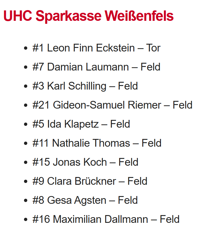 In der Folge erhöhten Jonas, Nathalie und nochmals Damian den Spielstand weiter. Mit einer klaren 7:1-Führung für Weißenfels endete das zweite Drittel. Im Schlussabschnitt zeigte der UHC erneut seine Überlegenheit. Die Defensive stand sicher, und Torhüter Leon überzeugte mit zahlreichen starken Paraden, die weitere Treffer für Chemnitz verhinderten. Offensiv setzte vor allem Damian weiterhin Akzente und erzielte vier weitere Tore. Kurz vor Spielende gelang Chemnitz sechs Sekunden vor dem Abpfiff noch ein letzter Treffer.